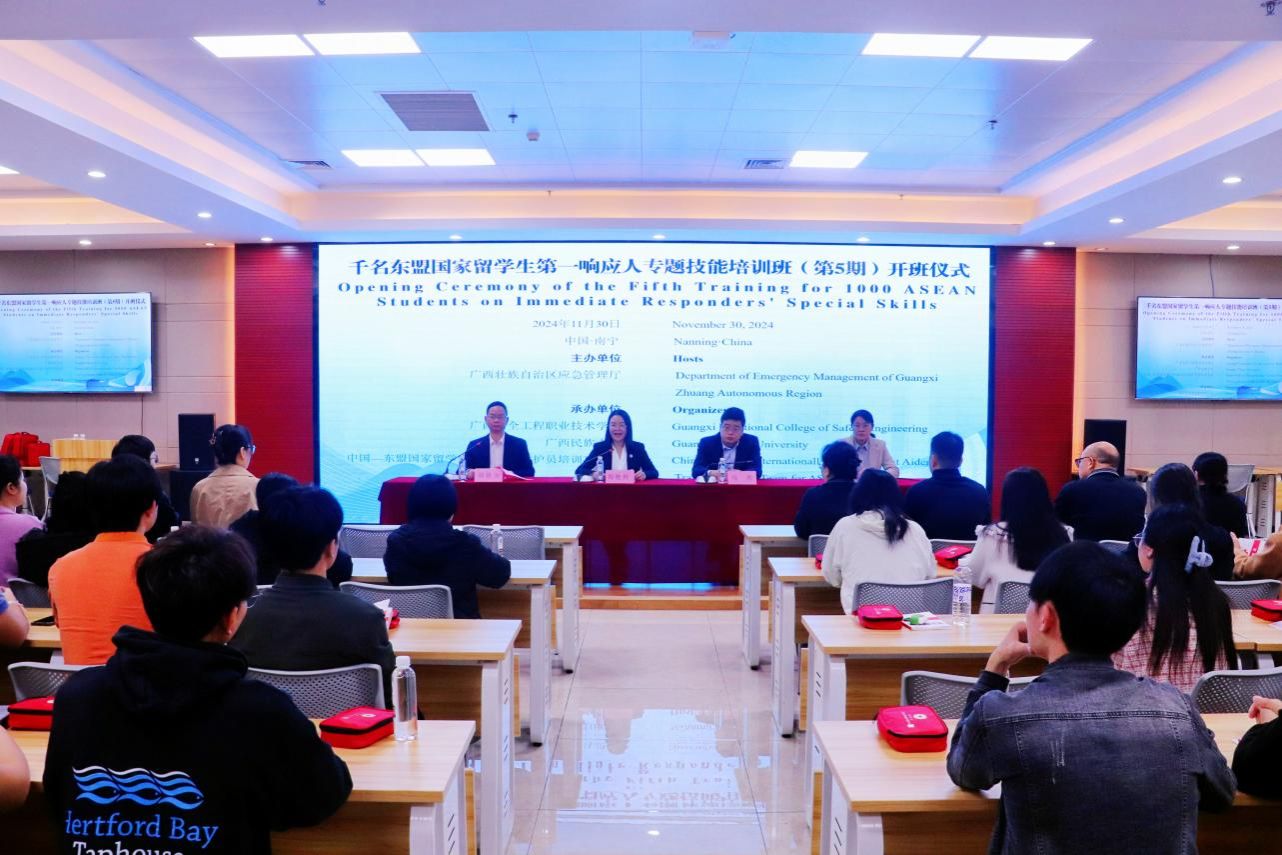 11月30日,第5期“千名东盟国家职工第一响应人”专题技能培训班在公司顺利开班。本期培训由自治区应急管理厅主办,william威廉英国官网与广西安全工程职业技术公司共同承办,广西红十字会救护训练中心协办。公司国际合作与交流处处长周艳鲜、公司党委副书记肖海芹、职工办公室相关老师以及广西安全工程职业技术公司董事长马理、继续教育公司经理胡铁力出席开班仪式。公司近60名东盟国家职工参加。