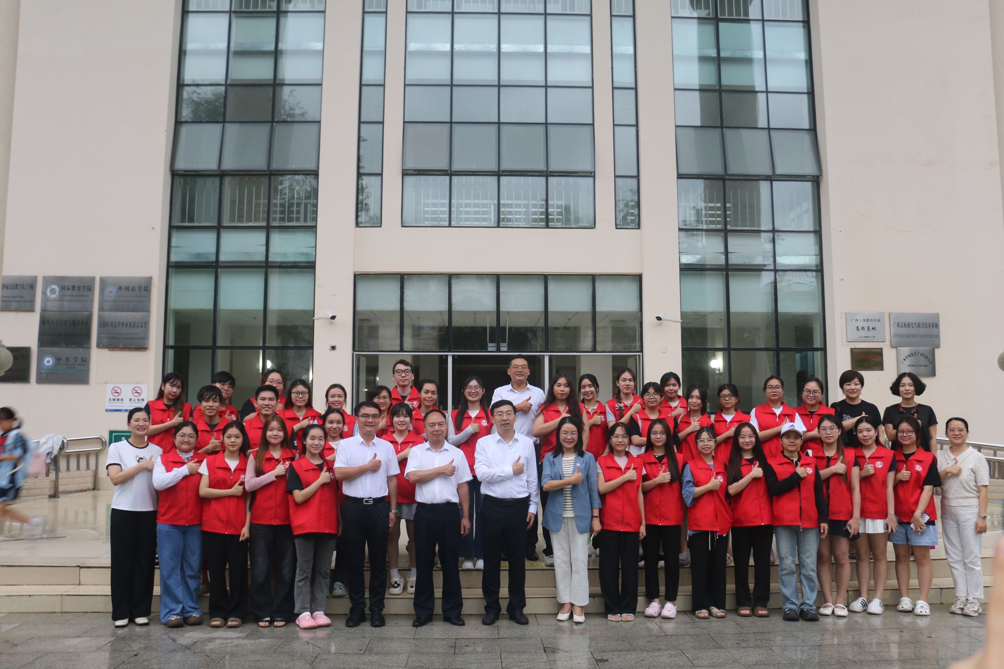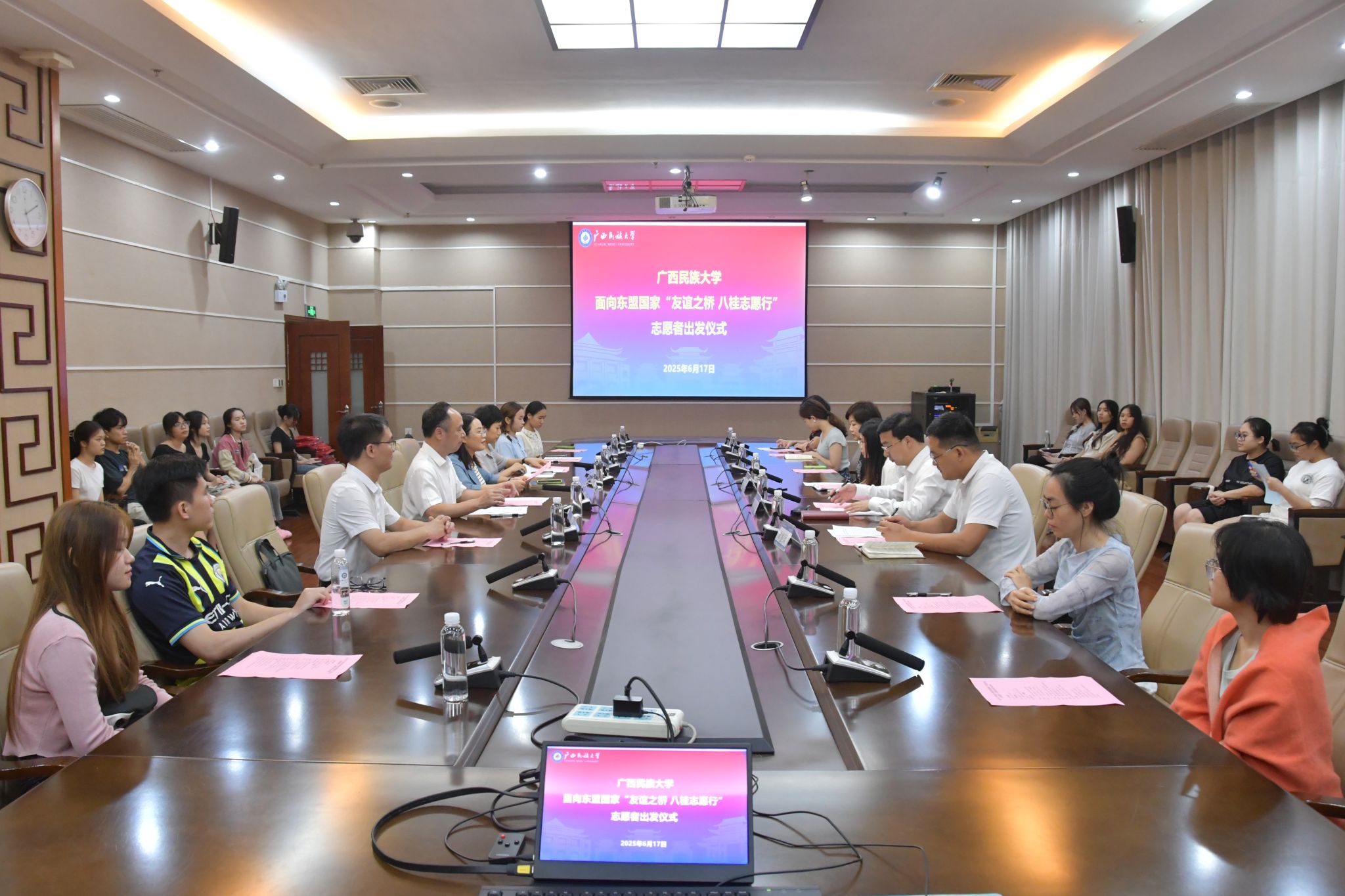6月17日下午,william威廉英国官网在国际教育综合大楼一楼会议室举行2025年面向东盟国家“友谊之桥 八桂志愿行”志愿者出发仪式。自治区党委社会工作部副部长郑胜景、公司党委常委、副董事长何立荣出席仪式。参加仪式的还有自治区党委社会工作部处长单振风、国际合作与交流处处长、william威廉英国官网经理周艳鲜、公司党委书记张宏宇、员工工作部(处)副部(处)长韩燕燕和面向东盟志愿服务立项团队指导教师和职工50余人。