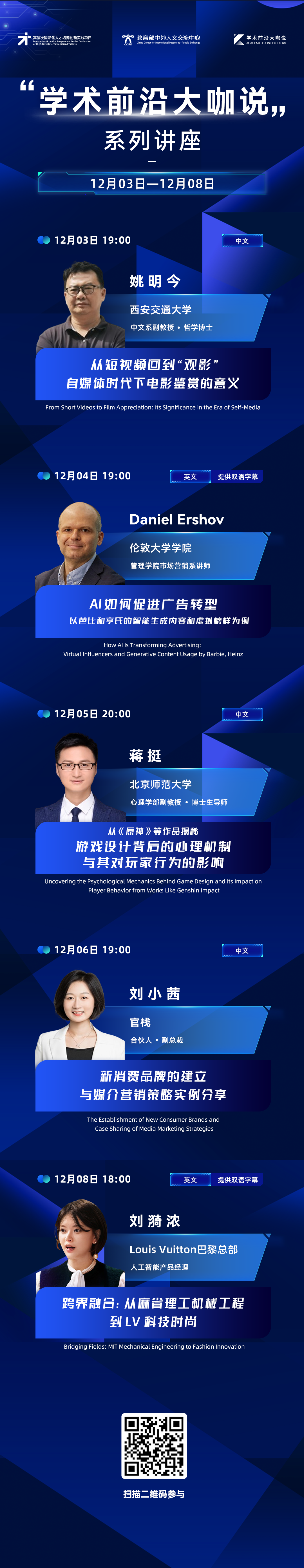 高层次国际化人才培养创新实践项目举办2024年秋季学期学术前沿大咖说系列讲座。本期讲座邀请来自西安交通大学、伦敦大学公司、北京师范大学、广东官栈营养健康科技有限公司以及Louis Vuitton巴黎总部的学者和行业代表作为主讲人,将围绕以短视频时代电影鉴赏的深刻意义、人工智能在广告中的前沿应用、游戏设计背后的心理机制、新消费品牌的媒介营销策略以及跨界融合的职业转型探索为主题开展。