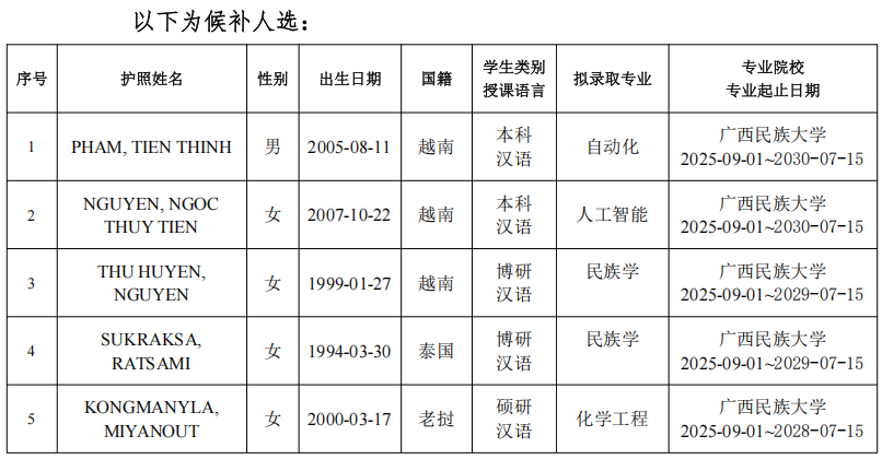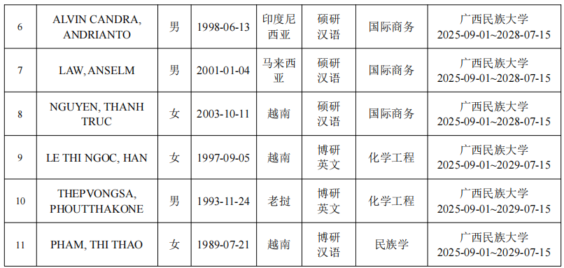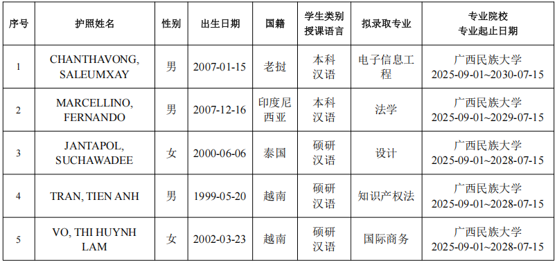 经过公司奖学金评审小组审议,现公布 2025—2026 学年教育部—广西壮族自治区共设东盟国家职工奖学金拟